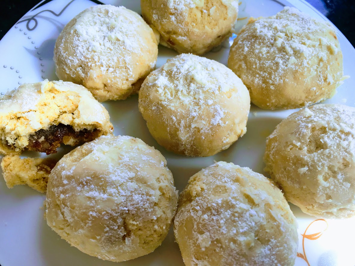 Maamoul are often made with high-protein semolina flour (coarsely ground durum wheat, the kind used to make pasta), flavored with rose water or orange blossom water, and shaped using ornate molds. The recipe below is a riff on traditional maamoul, made entirely with all-purpose flour. I used a Food Network recipe as a starting point and adapted it, developing my own rose water, date, and walnut filling. After removing the cookies from the oven, I rolled them in powdered sugar as is done with Russian tea cakes. To learn more about traditional maamoul, check out this interesting NPR story.
