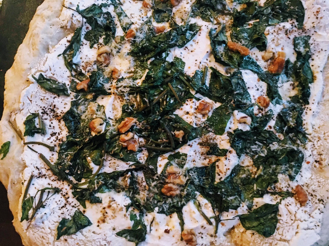 The other day, I was craving one of my favorite pizza toppings – homemade basil and walnut pesto – but my food processor had broken, and the new one had yet to arrive in the mail. So I prepared a pizza with deconstructed pesto: whole basil leaves, coarsely chopped walnuts, and grated Parmesan, sprinkled over a layer of creamy ricotta cheese. I drizzled on some olive oil and seasoned the pizza with freshly ground pepper and salt. The ricotta really shines in this recipe, so use a high-quality variety, if you can.